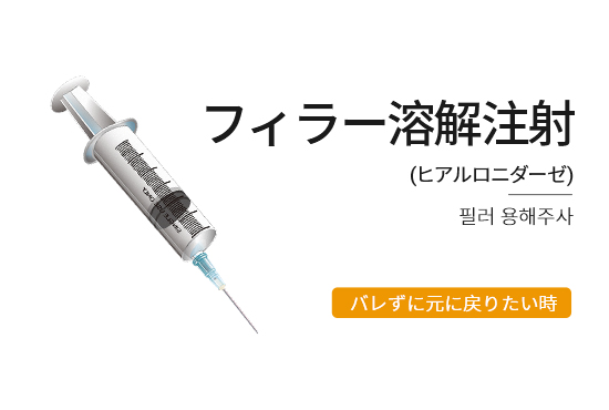 ヒアルロン酸による施術が気に入らなかったり施術したヒアルロン酸を溶かし再施術を計画している方に適切な施術です。 溶解が可能なフィラーは以下の通りです。
